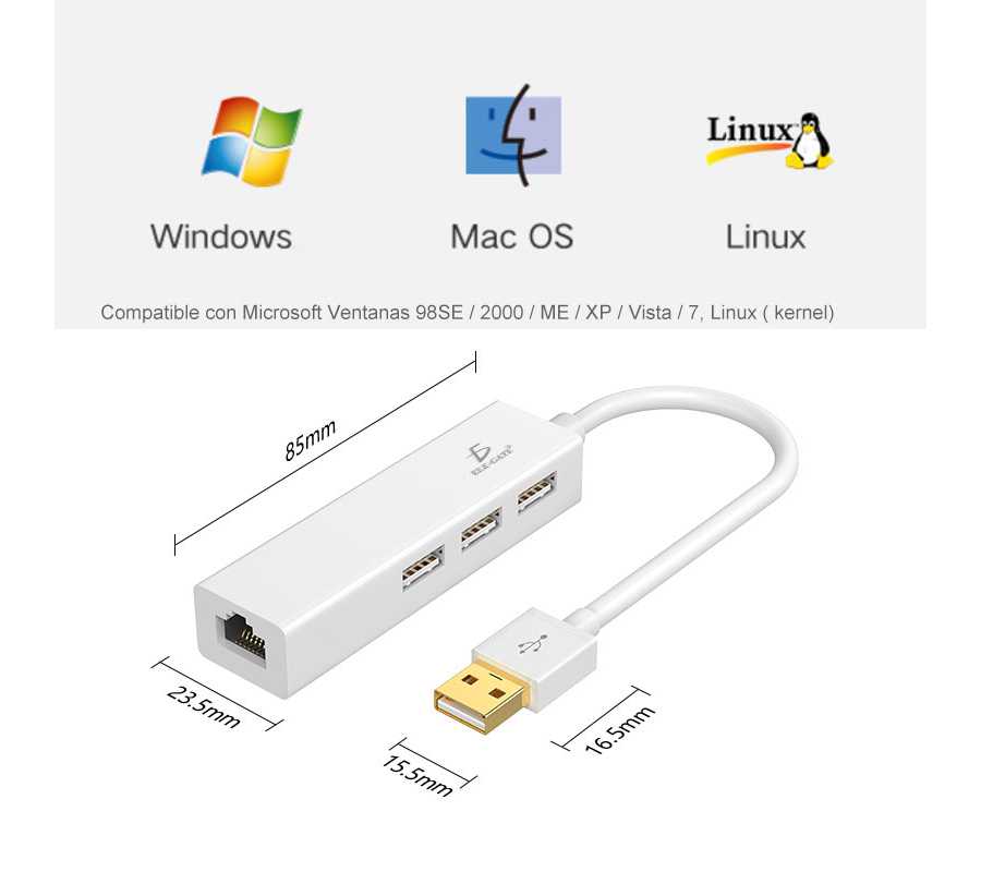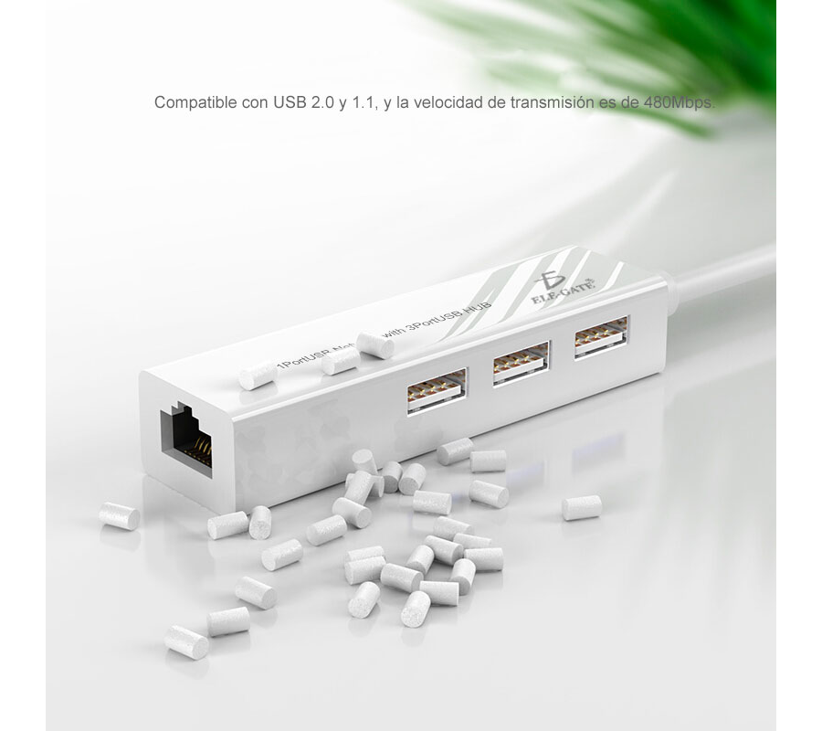 Utilice esta red Ethernet RJ45 de 1 puerto con HUB USB 3 puertos que se puede conectar fácilmente a una red Ethernet con el adaptador Ethernet USB pequeño y liviano. Ella conecta a puerto USB 2.0 de su computadora y proporciona un RJ -45 que soportes rendimiento 10 / 100BASE- T .