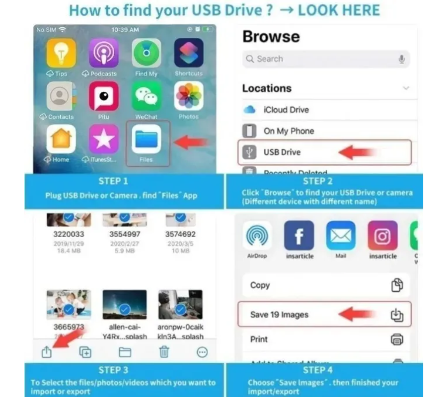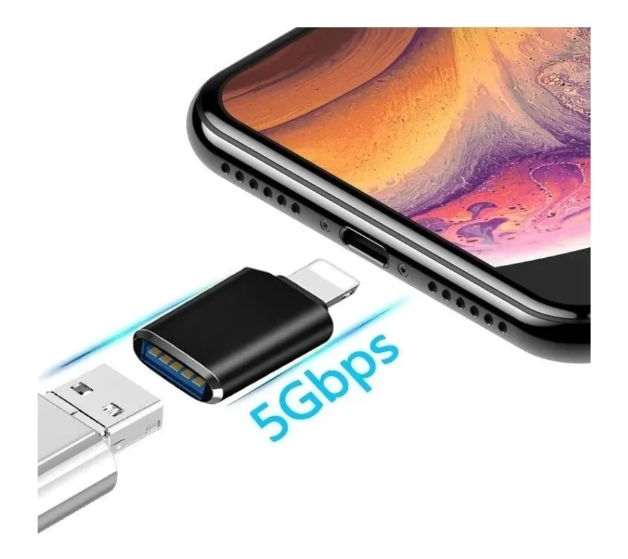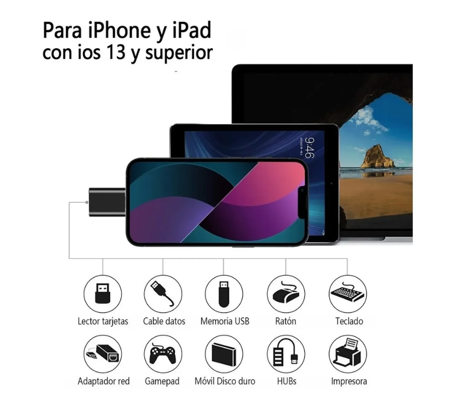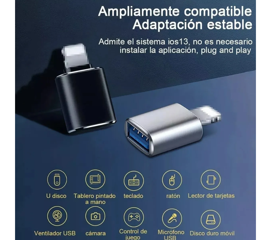 Adaptador USB 3.0 OTG compatible con modelos de iPhone 14, 13, 12, 11 Pro, XS Max, XR, X, 8 Plus, 7, 6S, y iPad; Adaptador macho Lightning a USB 3.0 para iOS versión 13 y posterior.