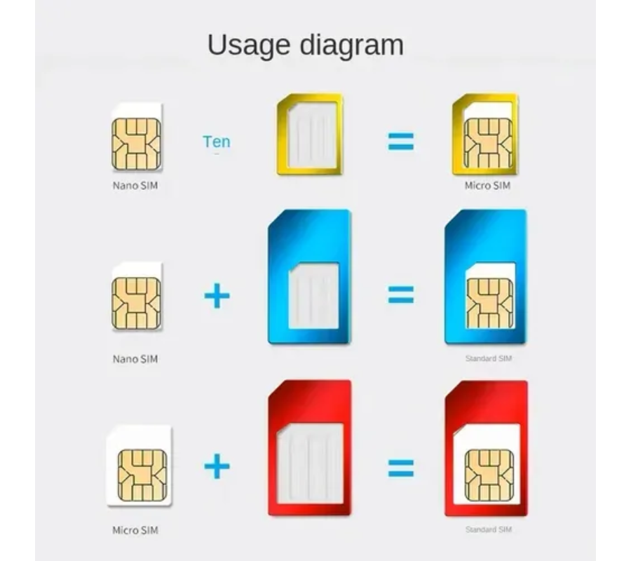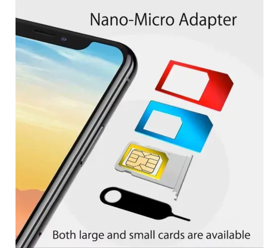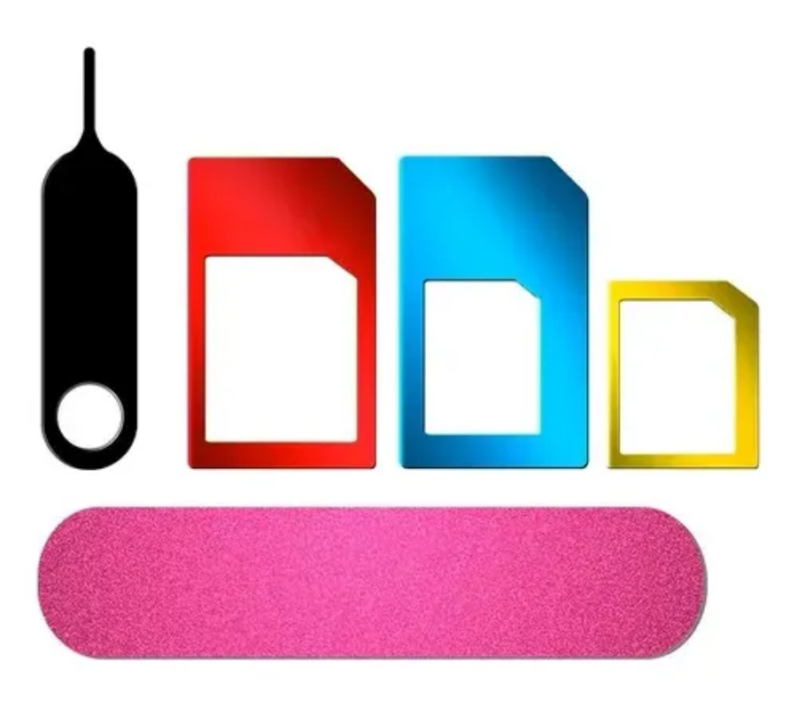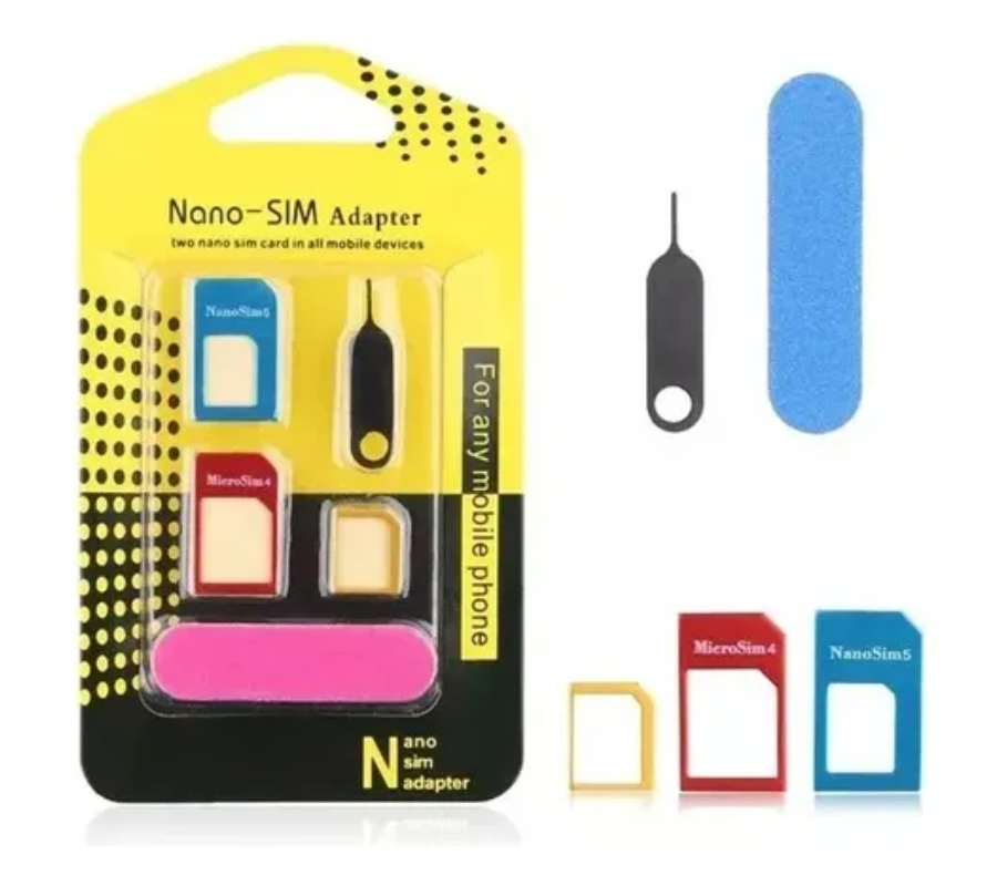 Juego de adaptadores para tarjetas SIM que permite usar una SIM nano en cualquier teléfono que requiera una tarjeta de otro tamaño, ya sea micro o estándar.