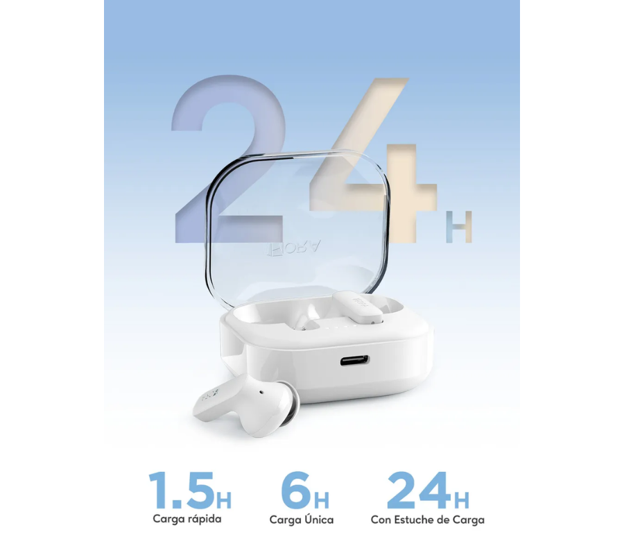 Disfruta de hasta 6 horas de reproducción en una sola carga y hasta 24 horas en total con el estuche. Carga rápida en solo 1.5 horas para mayor comodidad. Fácil de Usar Solo retira la etiqueta azul de aislamiento (quita la etiqueta azul de aislamiento) y tus audífonos se conectarán automáticamente con tu dispositivo.