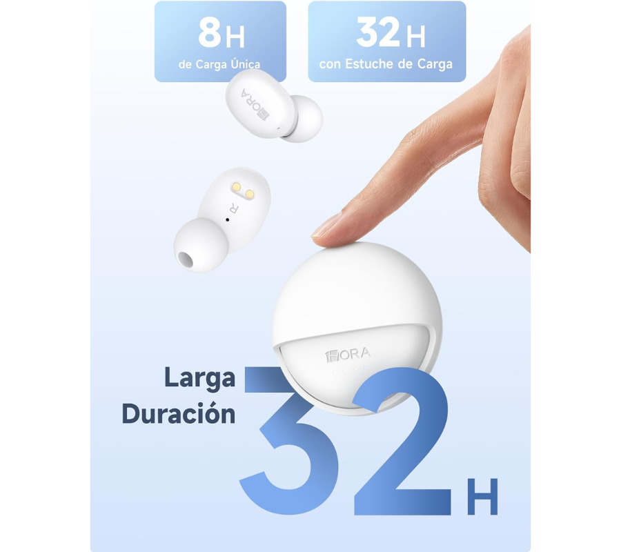Hasta 32 horas de autonomía total con el estuche completamente cargado Cada audífono ofrece hasta 8 horas de reproducción continua, incluso al 100 % de volumen Perfectos para jornadas largas, viajes o uso diario intensivo.