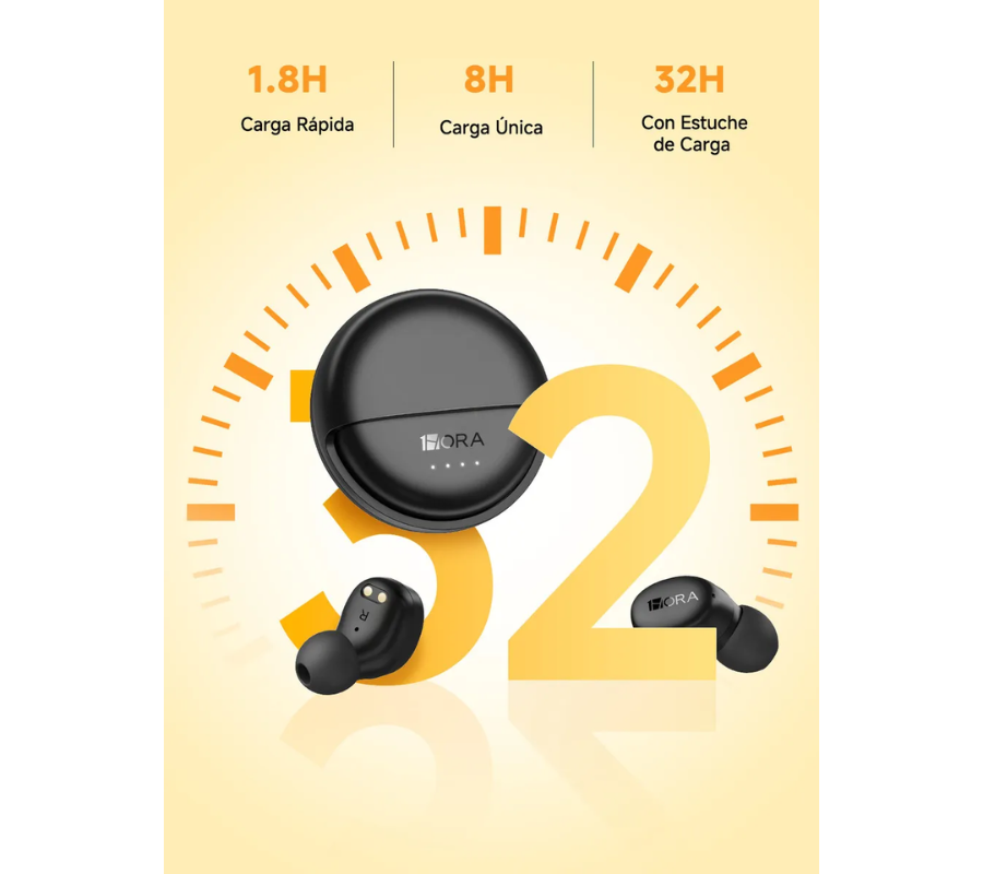 Hasta 32 horas de autonomía total con el estuche completamente cargado Cada audífono ofrece hasta 8 horas de reproducción continua, incluso al 100 % de volumen Perfectos para jornadas largas, viajes o uso diario intensivo.