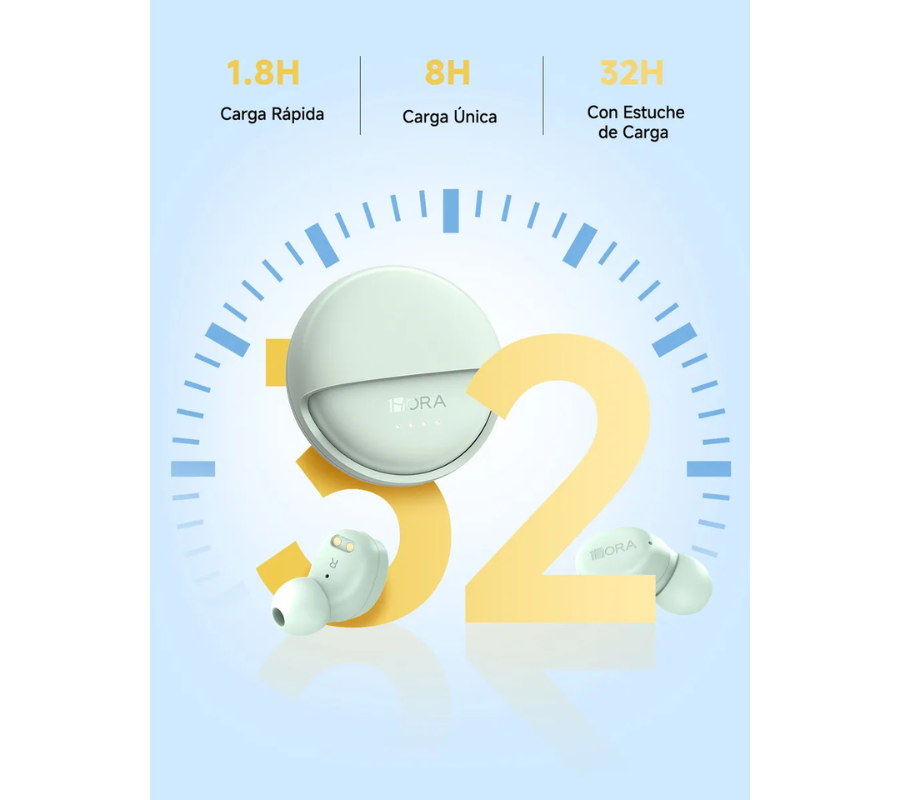 Hasta 32 horas de autonomía total con el estuche completamente cargado Cada audífono ofrece hasta 8 horas de reproducción continua, incluso al 100 % de volumen Perfectos para jornadas largas, viajes o uso diario intensivo.