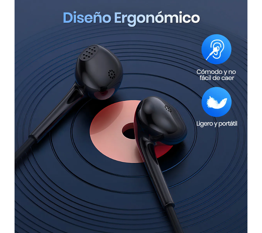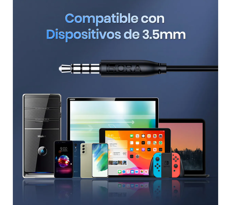 - Conector de audio estándar de 3.5 mm para compatibilidad con una amplia gama de dispositivos.