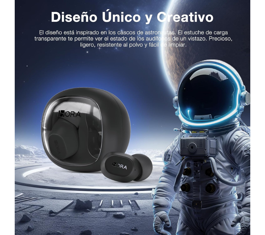 - Diseño Único y Creativo: Audifonos Inalambricos diseño está inspirado en los cascos deastronautas. El estuche de carga transparentete permite ver el estado de los audífonos deun vistazo. Precioso, ligero, resistente al polvoy fácil de limpiar