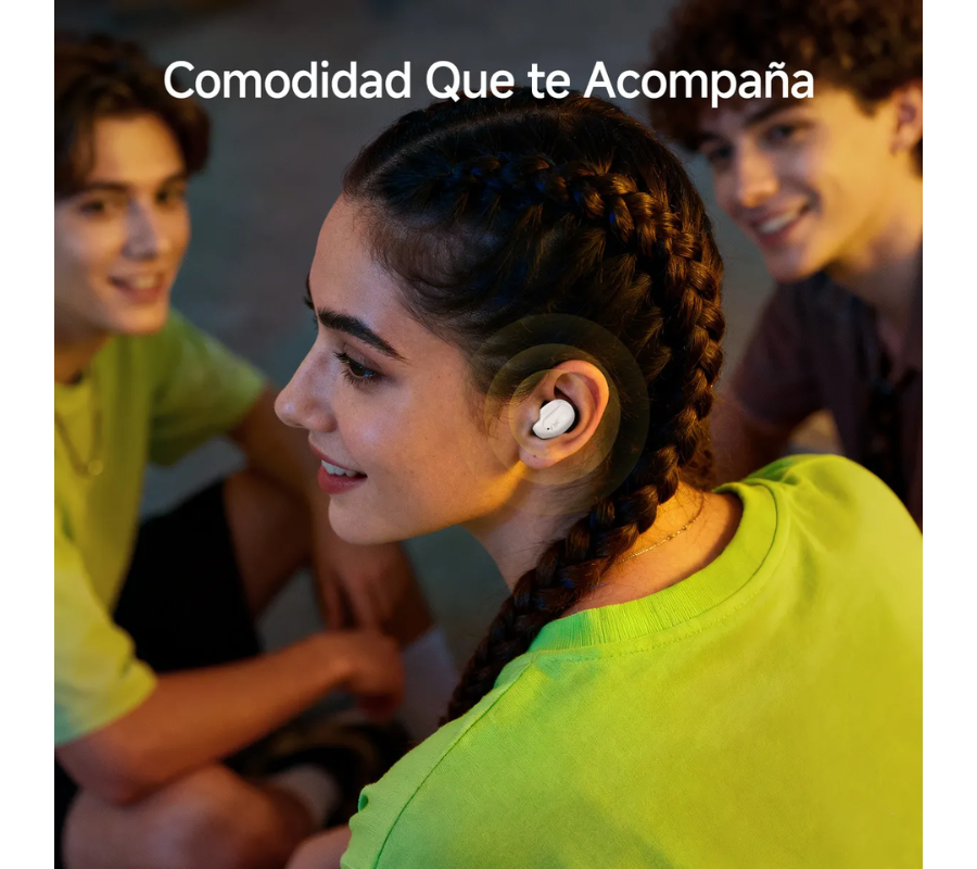 Auriculares inalámbricos compactos con Bluetooth 6.0 que ofrecen hasta 6 horas de reproducción con una sola carga y 24 horas con el estuche de carga. Su carga tipo C y su diseño ligero de 92 g los hacen ideales para desplazamientos diarios, trabajo y entrenamiento.