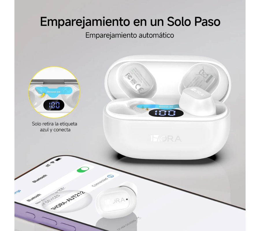 Solo retira la etiqueta azul de aislamiento (quita la etiqueta azul de aislamiento) y tus audífonos se conectarán automáticamente con tu dispositivo.
