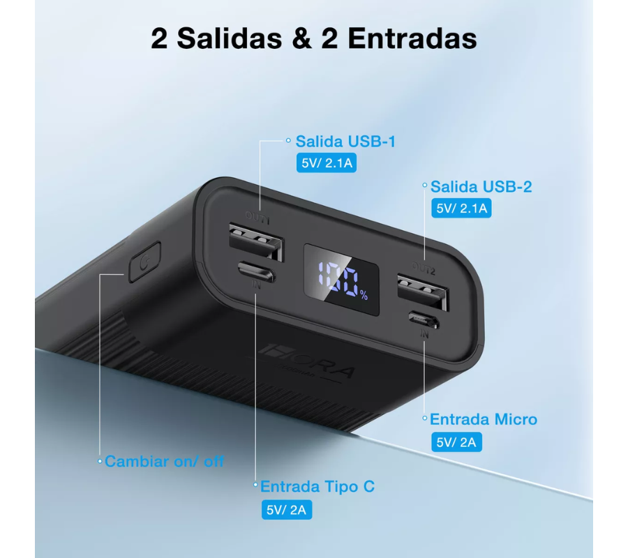 - Dos Puertos: Con dos puertos de entrada de Micro usb y Tipo-c, y dos salidas de USB, logra cargar dos dispositivos al mismo tiempo con el voltaje de 5.