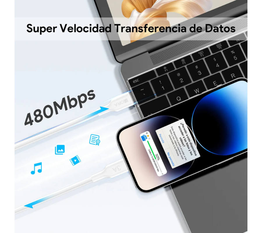 Conecte el extremo lightning (IP 3A) al puerto de carga de su dispositivo compatible (por ejemplo, iPhone o iPad). Transferencia de datos: Conecte el extremo Tipo-C a una computadora para transferir archivos y sincronizar datos con el dispositivo conectado.
