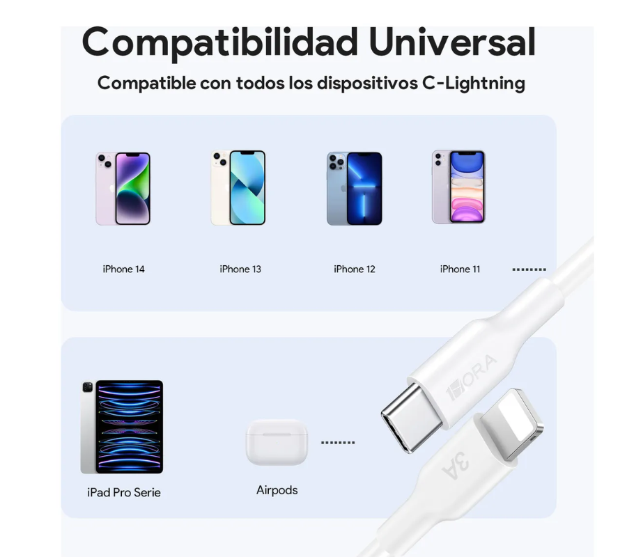 Compatibilidad: Dispositivos con puerto lightning (iPhone, ipad, ipod) y fuentes de poder con puerto USB-C.