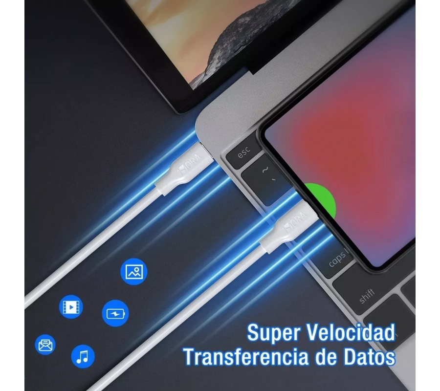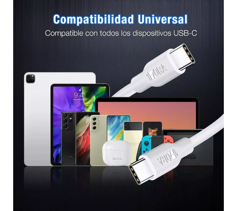 Cable Reforzado Tipo C a Tipo C con tasa turbo de corriente a 3A. El cable funciona para carga y transferencia de datos con tasa de corriente de salida de 3 A. Es compatibles para cualquier dispositivo con entrada tipo C: ya sea tableta, teléfono inteligente, consola de videojuegos y más.