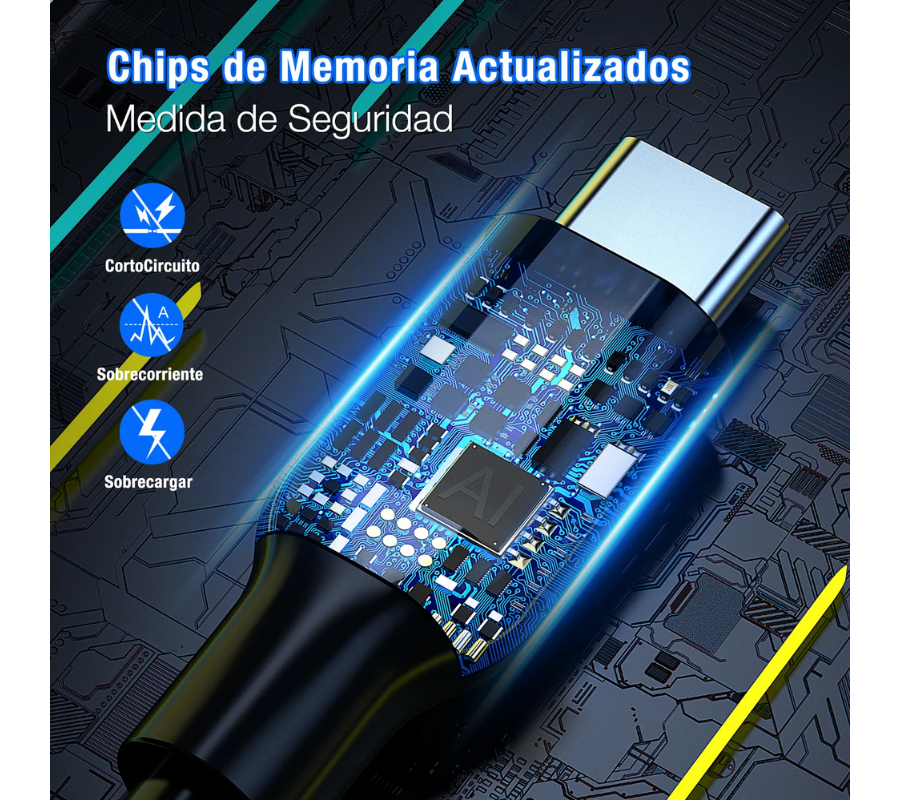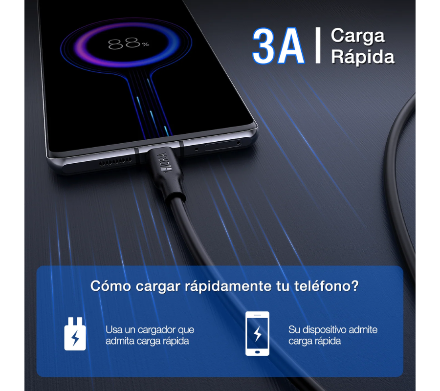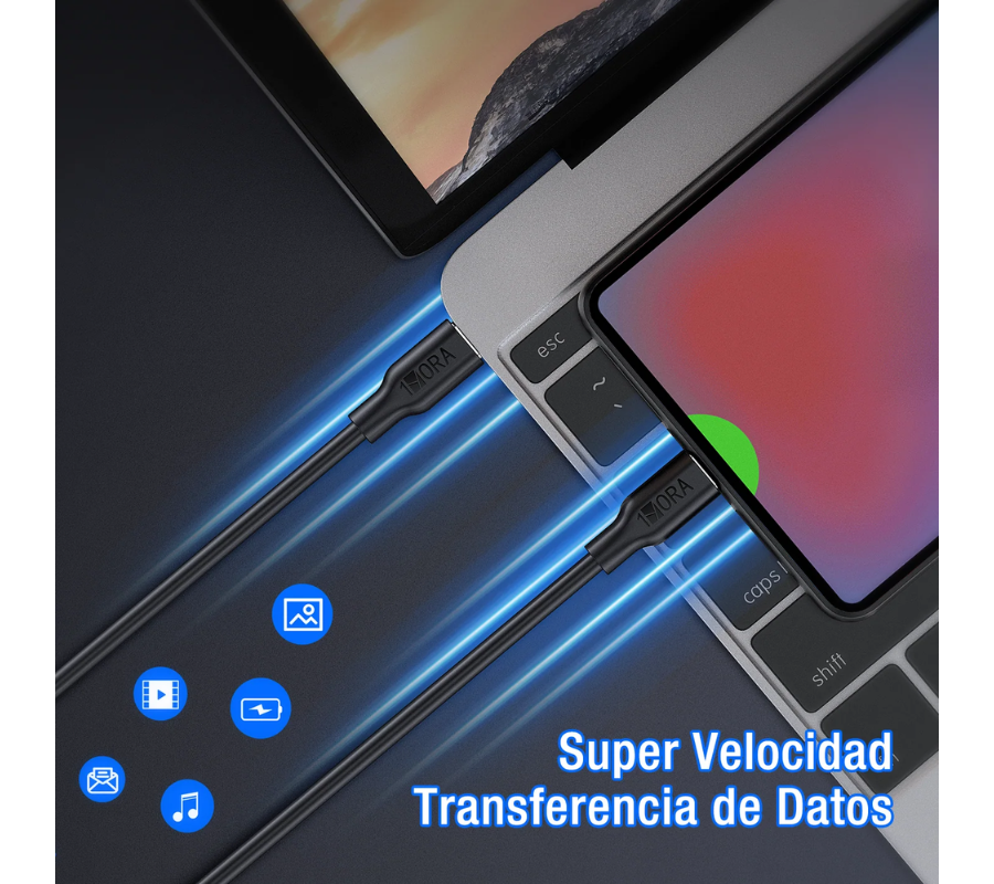 Cable Reforzado Tipo C a Tipo C con tasa turbo de corriente a 3A. El cable funciona para carga y transferencia de datos con tasa de corriente de salida de 3 A. Es compatibles para cualquier dispositivo con entrada tipo C: ya sea tableta, teléfono inteligente, consola de videojuegos y más.