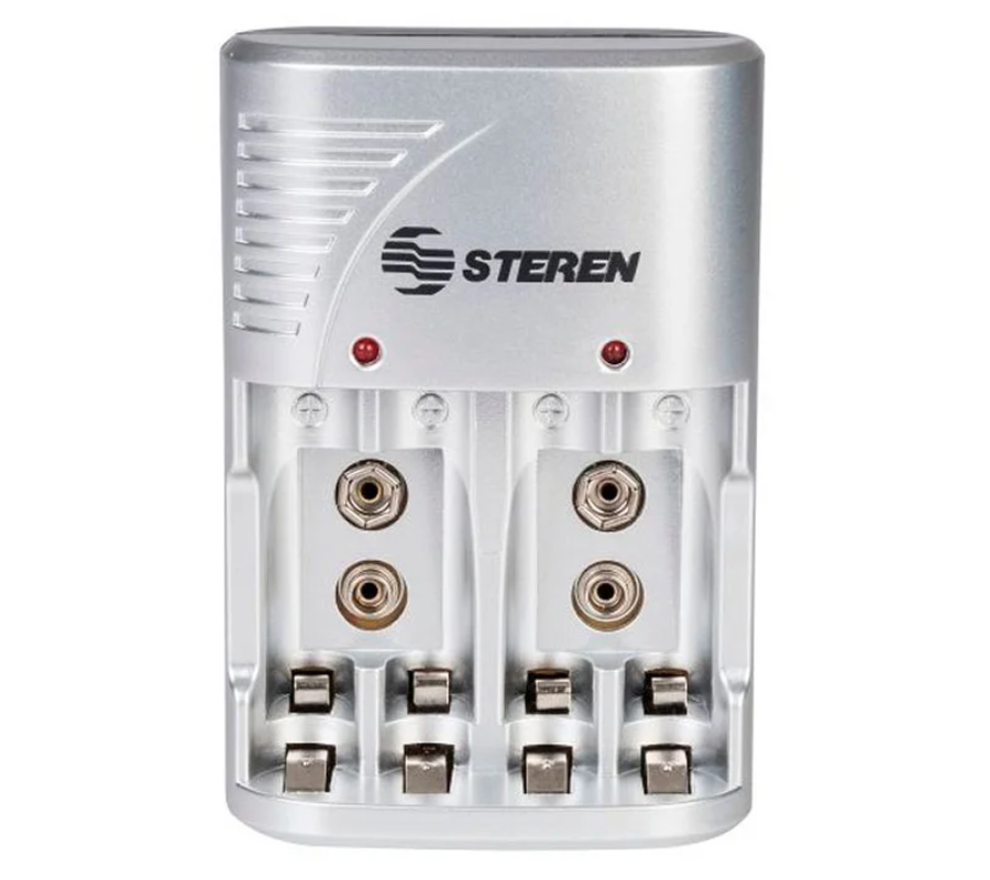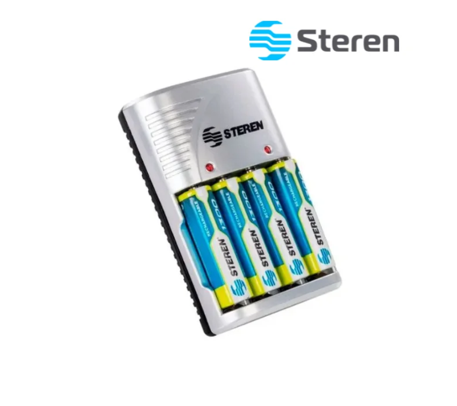 Cargador de 4 Pilas AA/AAA/9V STEREN CRG-020, Contiene 4 Pilas Recargables AA, 1300mAh