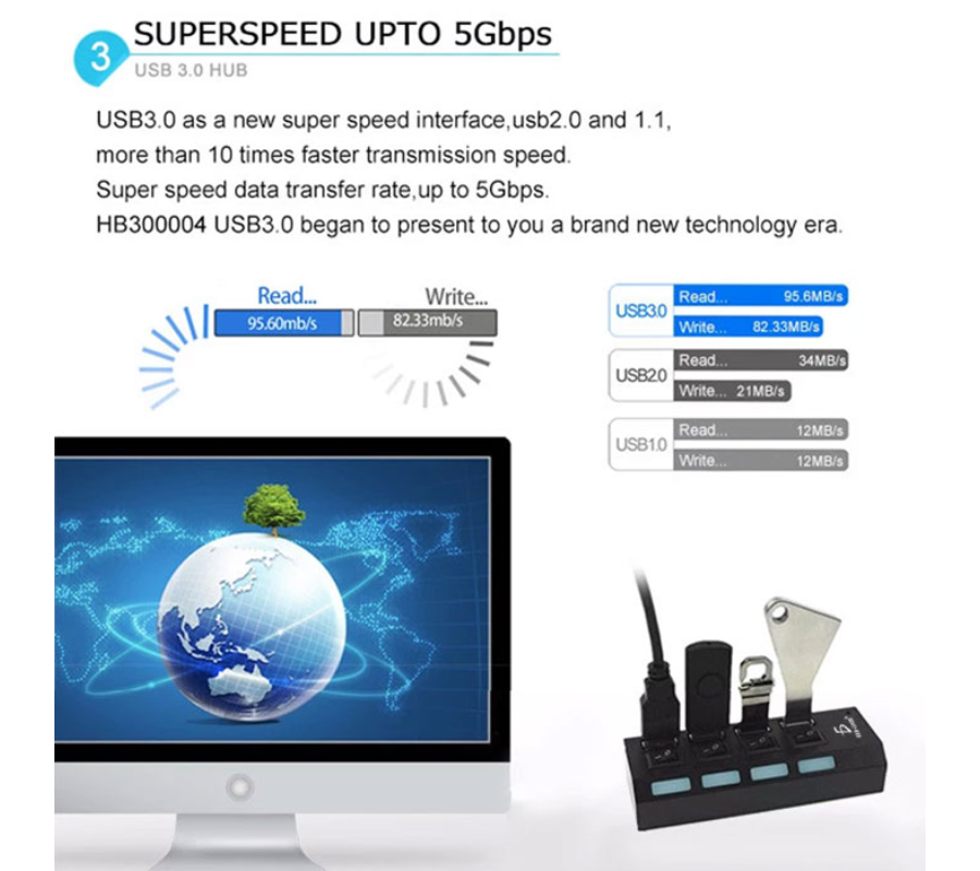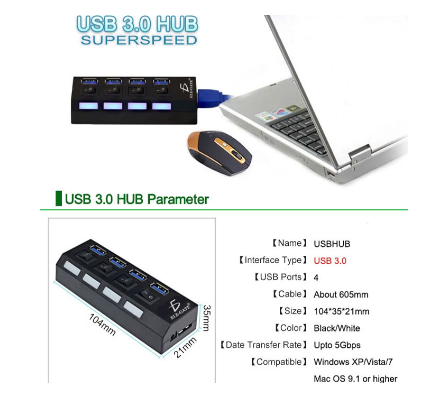 Hub Usb 3.0 4 Puertos Con Switch Led Laptop Pc Mac Windows