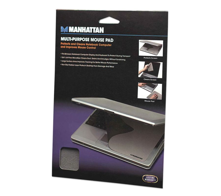 El Mousepad Multipropósito MANHATTAN se ajusta en la mayoría de los monitores de la portátil, entre éste y el teclado para protegerlo de daños durante su transportación. Su suave microfibra remueve el polvo del monitor sin dejar ralladuras.