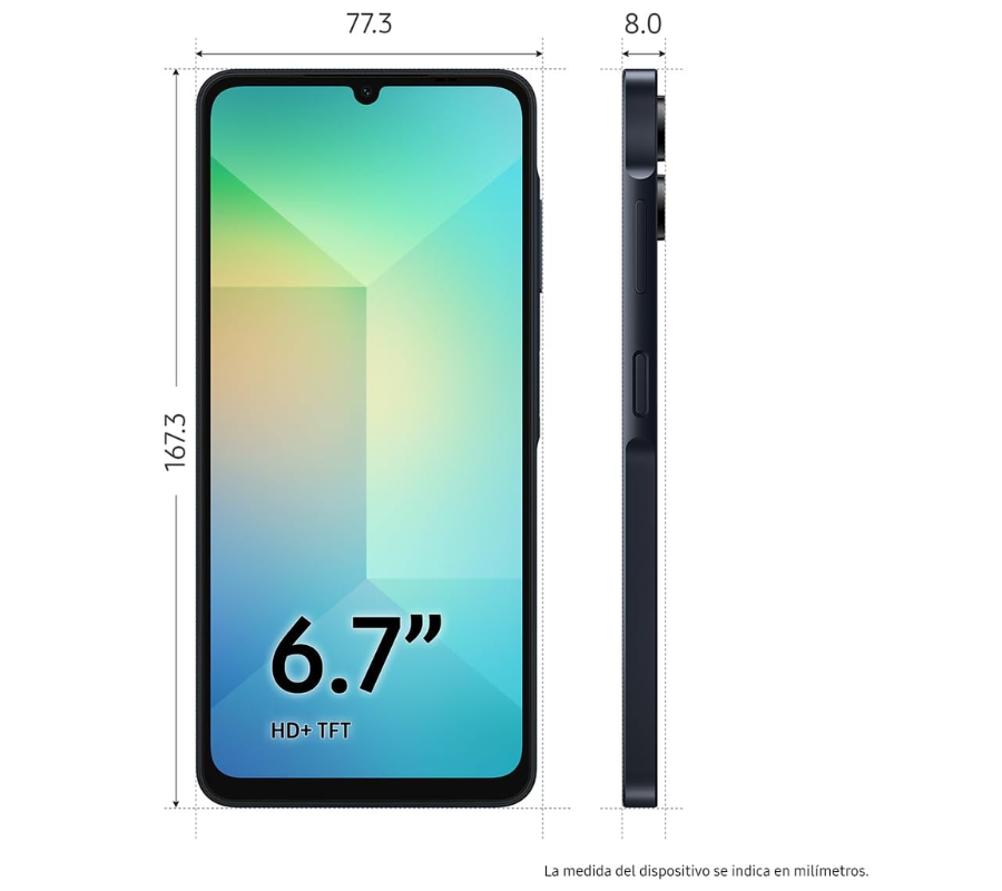 El diseño del Samsung Galaxy A06 es elegante, con un grosor de 8 mm, un ancho de 77.3 mm y una altura de 167.3 mm.