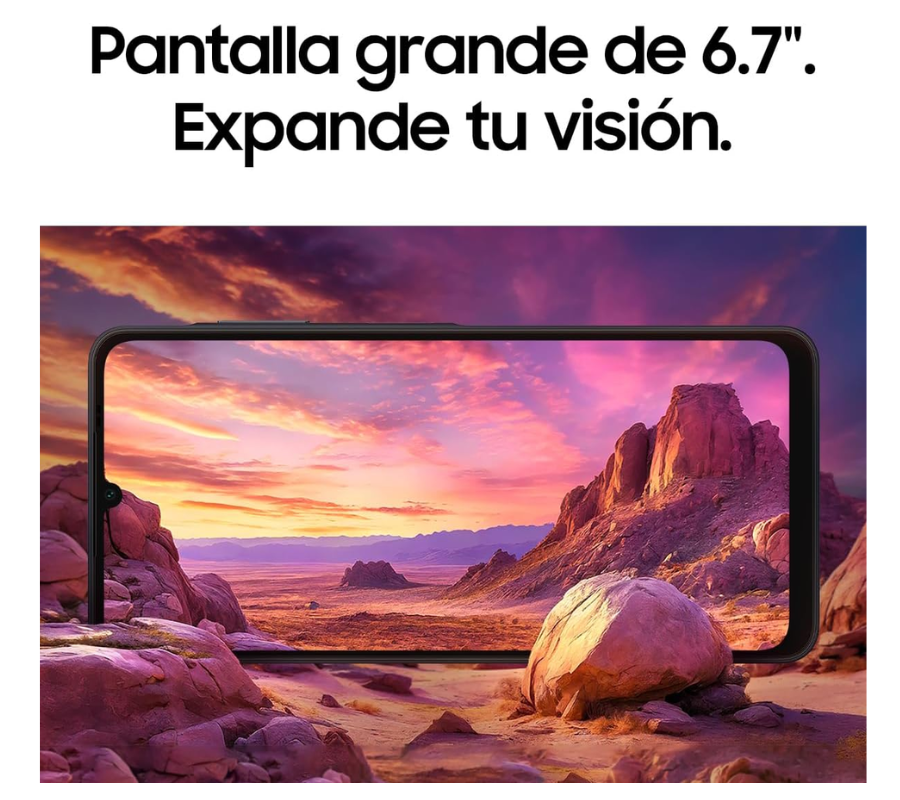 El Samsung Galaxy A06 es un smartphone que destaca por su pantalla de 6.7 pulgadas con una resolución de 720 x 1600 píxeles y una relación de aspecto nativa de 20:9.