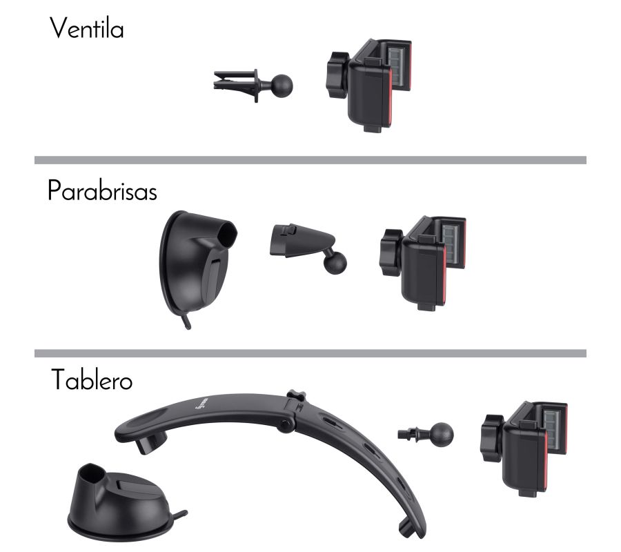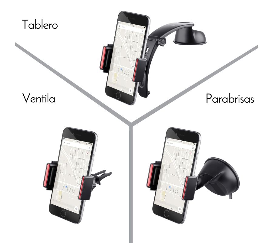 Coloca tu smartphone de 3 maneras diferentes en tu auto: en el parabrisas, tablero o ventilas. Con ventosa de alto vacío para una sujeción firme Su clip sujetador asegura tu celular perfectamente Tú elijes el lugar para colocar tu celular!